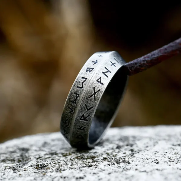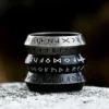 Questo anello in acciaio inossidabile è inciso con le antiche rune norrene, simboli di forza, protezione, vittoria e destino.