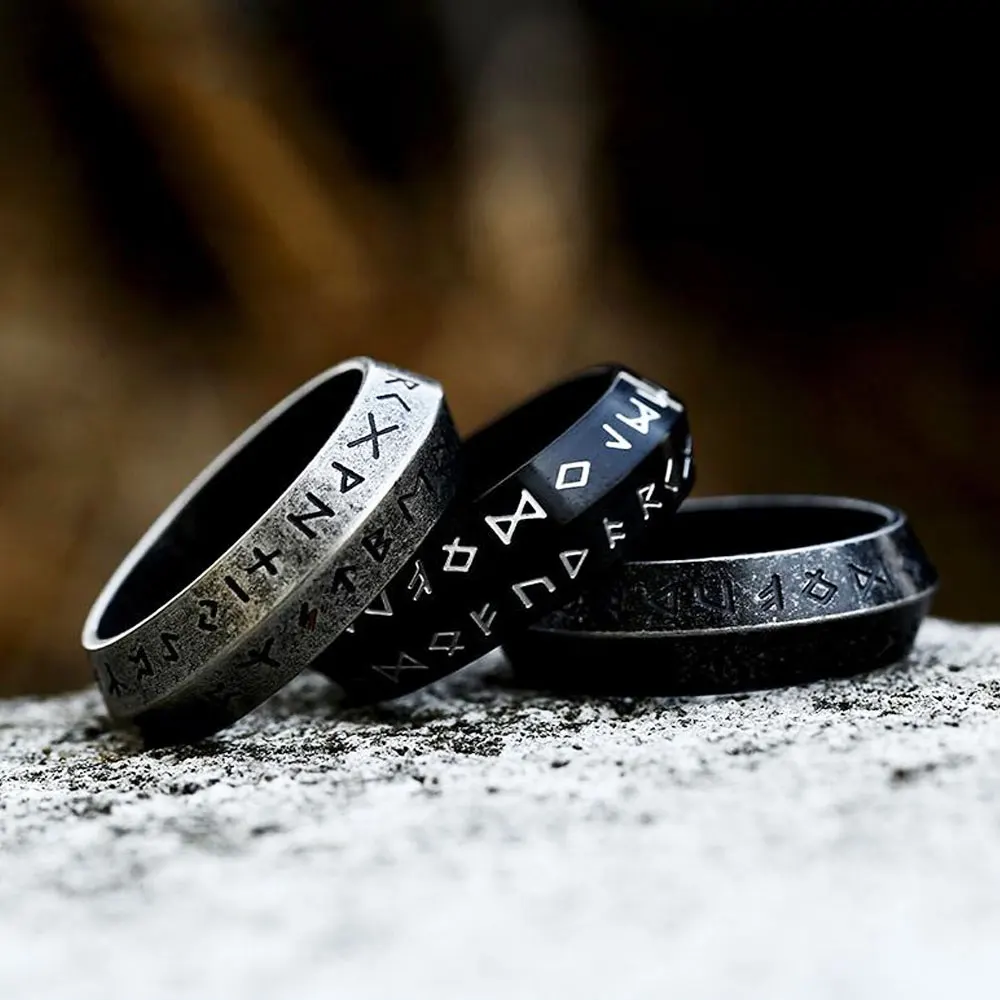 Questo anello in acciaio inossidabile è inciso con le antiche rune norrene, simboli di forza, protezione, vittoria e destino.