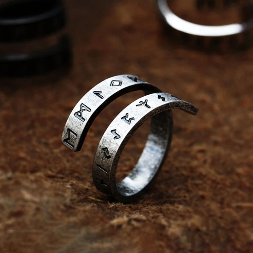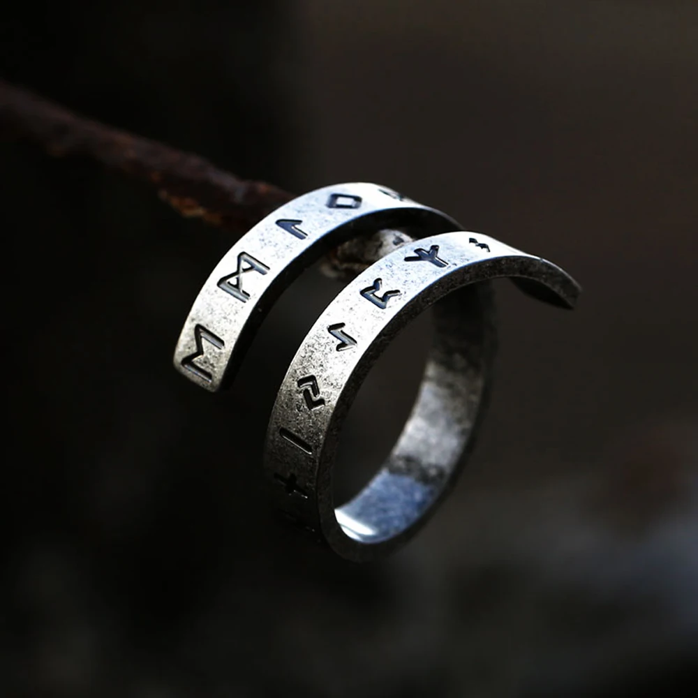 Questo anello regolabile in acciaio inossidabile è inciso con rune vichinghe, simboli ancestrali di protezione, saggezza, trasformazione e destino.
